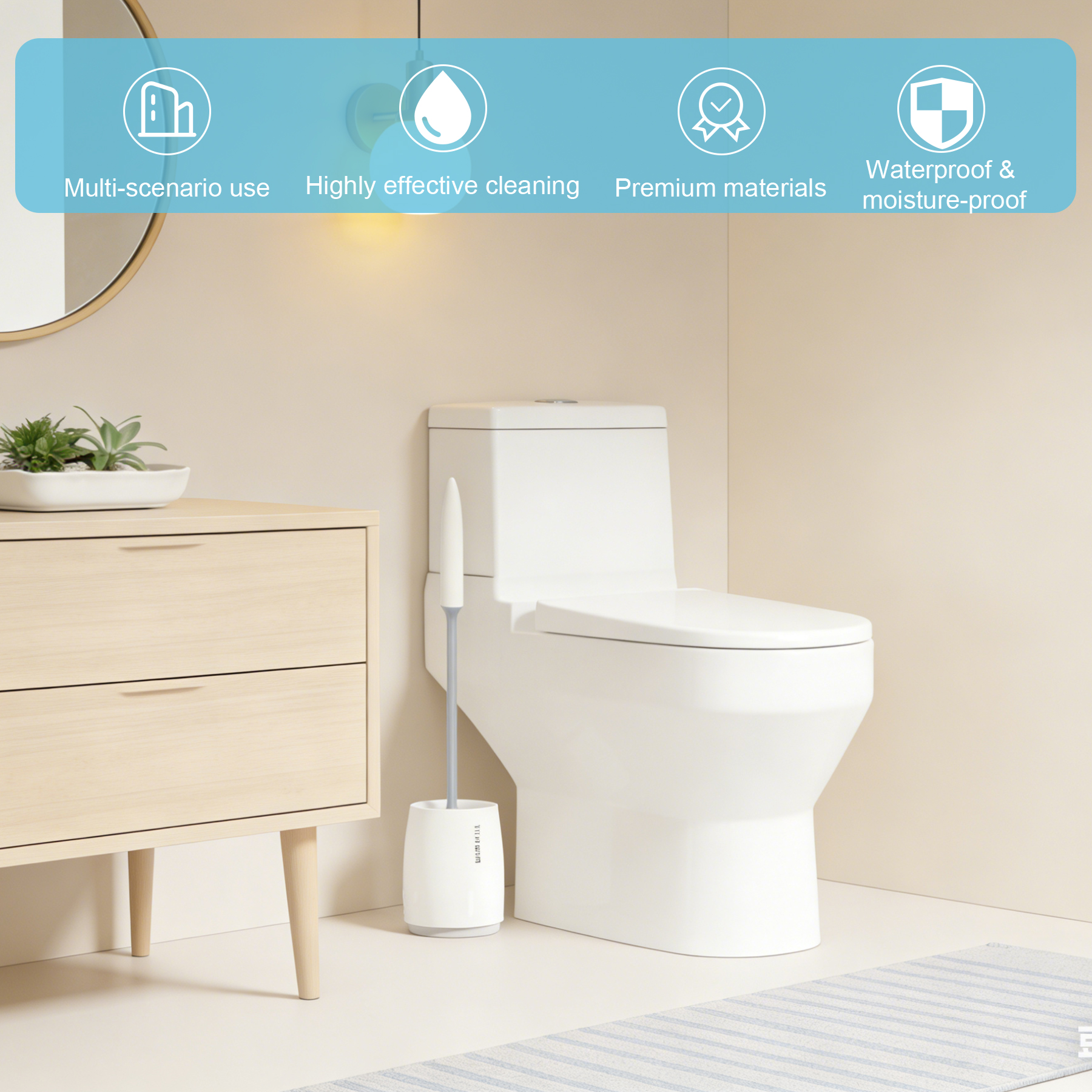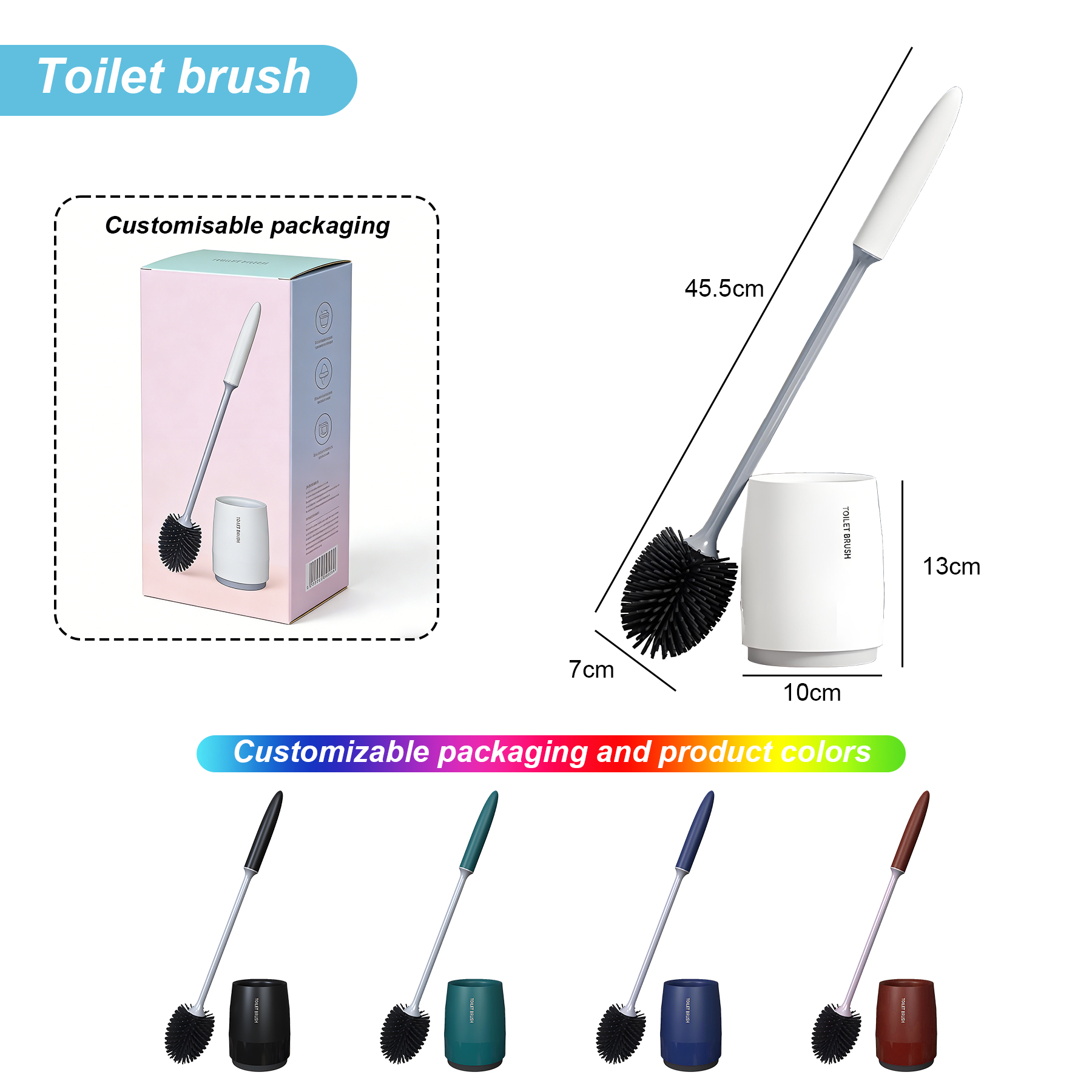 Modern toilet brush made of plastic, TPR plastic, and soft rubber bristles, designed for bathroom toilet cleaning with a storage holder, durable handle, and customizable logo, color, shape, and packaging options.